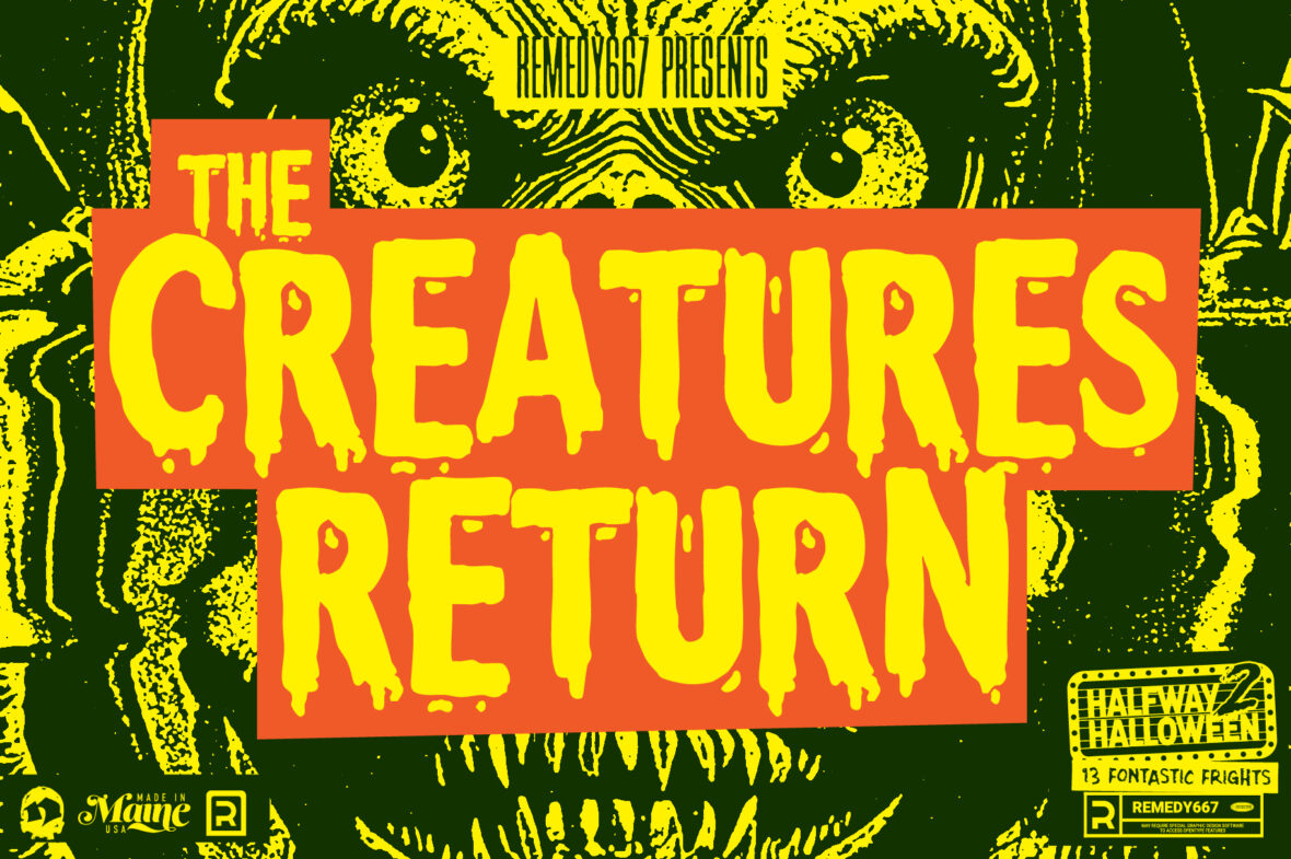 This ghoulish goodie is clawing its way into your design toolkit! Creatures Return has bold, creepy curves and monstrous charisma, it’s perfect for titling your creature features, flyers, or any design that needs a little shock… and schlock.